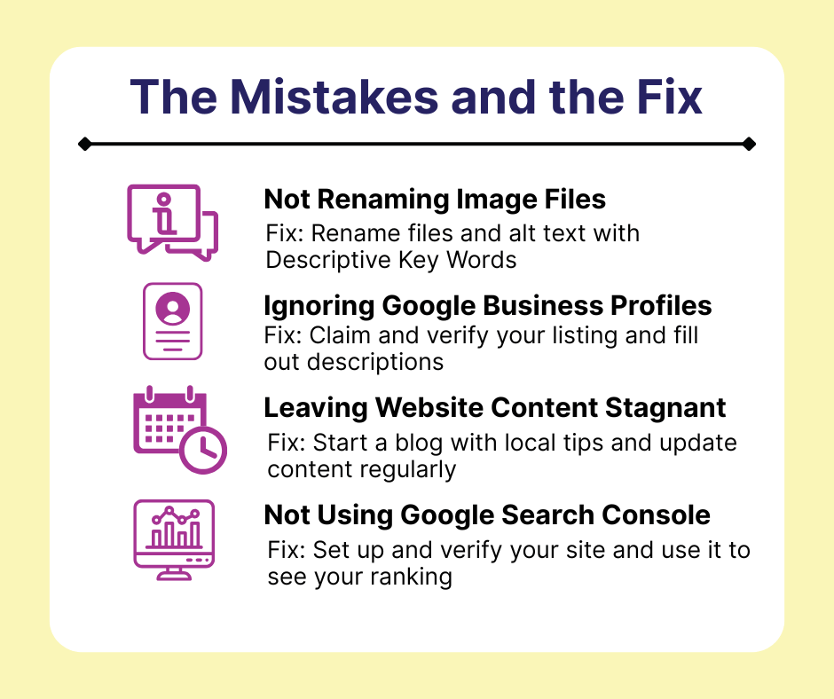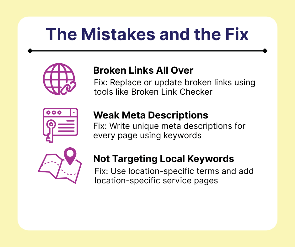 But here’s the catch: even small SEO mistakes can prevent your business from showing up in local search results, just when people are ready to buy. That means missed clicks, lost leads, and less revenue.