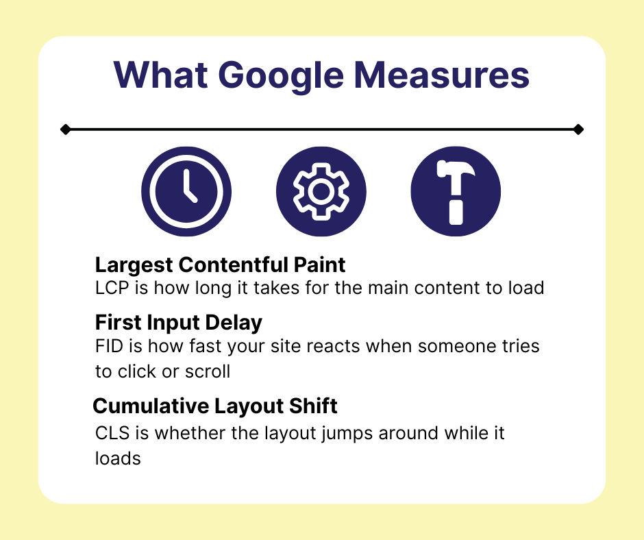 Basically, Google tracks how smooth and fast your site is. If your website is slow or clunky, your rankings might take a hit. Even if your content is amazing.