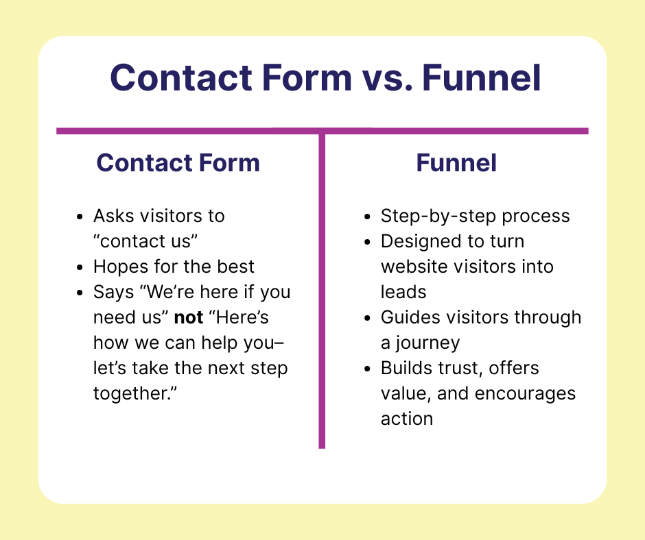 Instead of asking visitors to “contact us” and hope for the best, a funnel guides them through a journey that builds trust, offers value, and encourages action.